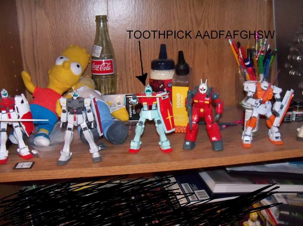 http://i419.photobucket.com/albums/pp27 ... 1_0223.jpg My collection of Mobile Suits (GMs to be exact, along with the fabled GM Toothpick, Boring stupid books blacked out because most of 'em ain't mine)