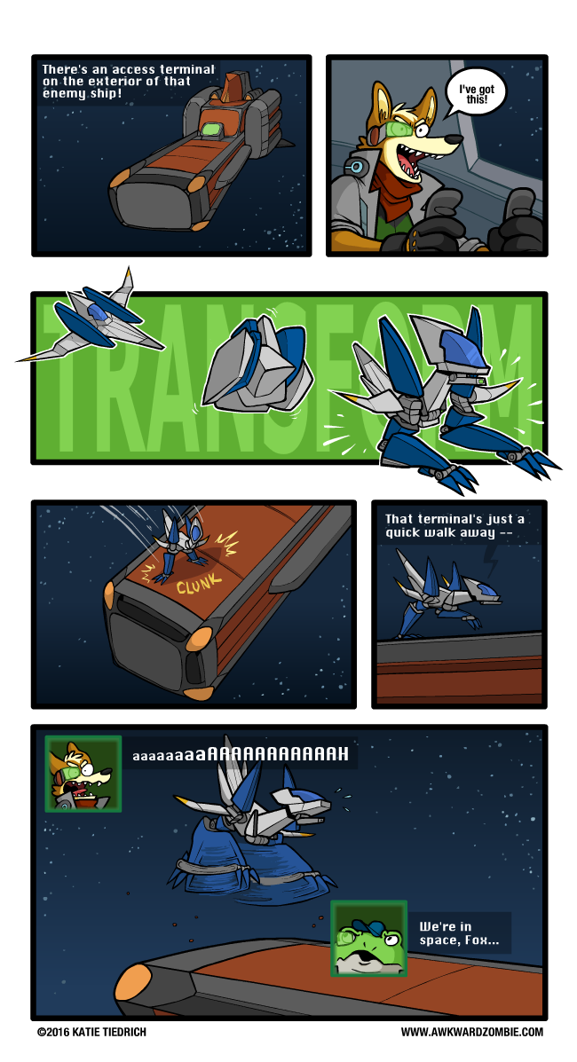 Transforming into the arwing chickenwalker seems to summon a mysterious gravitational force to conveniently suck you down to a surface to let you walk around on it, because that's how things work in space. My favorite is transforming in the middle of nowhere and having the thing plummet "down" into infinity.