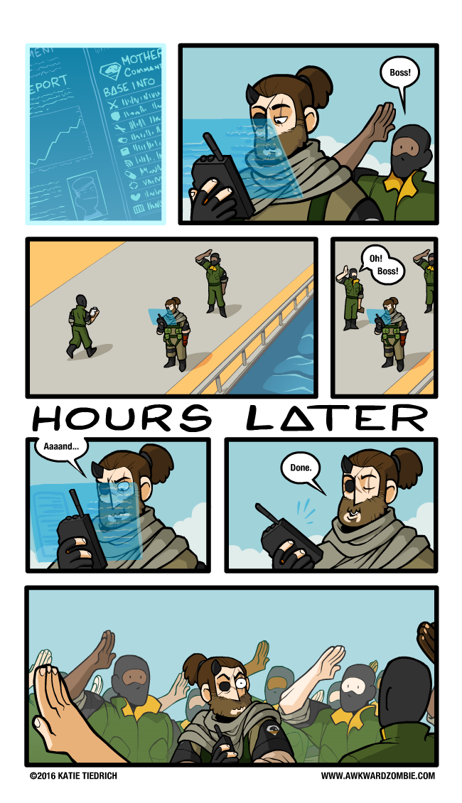 IT'S ONE THING to be unable to salute back to your fellow Diamond Dogs, but the way they walk up and salute you while you ignore them just makes me feel bad. Especially in a game where there's no pause button, so I walk away from the TV and come back to find that some guy has spent ten minutes saluting Big Boss while he stoically stares into space.